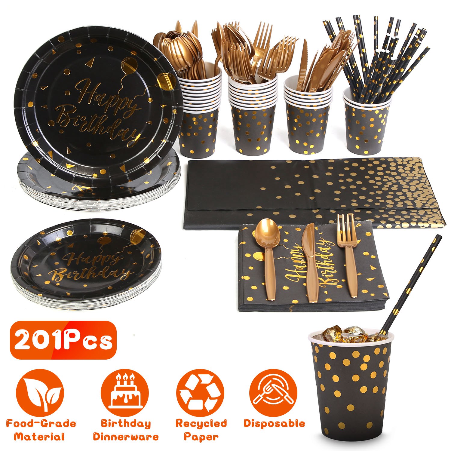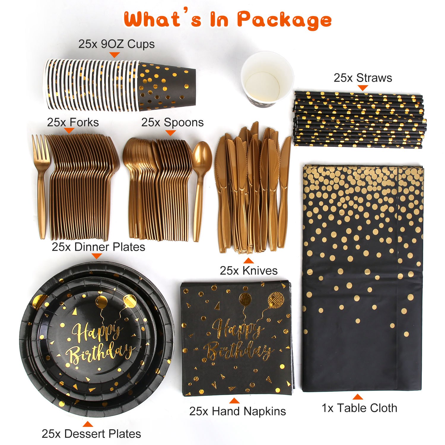 201PCS Black Gold Birthday Party Supplies For 25 Guests Happy Birthday Disposable Dinnerware Set Paper Plates 9OZ Cups Straws Napkins Forks Knives Spo